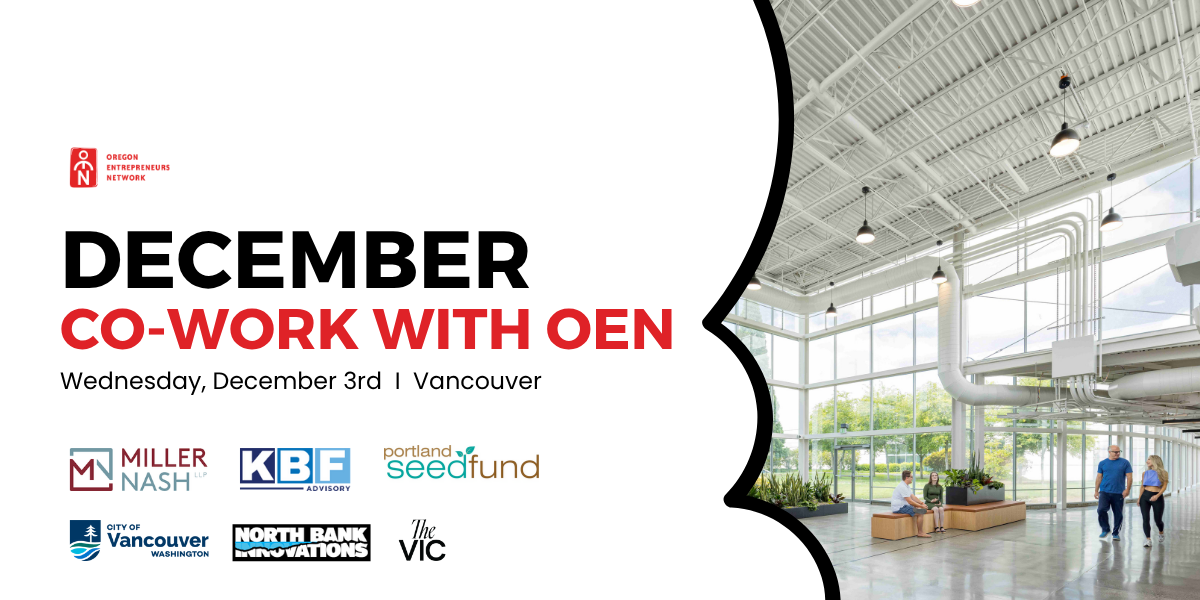Oregon Entrepreneurs Network is partnering with our friends at Miller Nash to host Co-Work with OEN on Wednesday, December 3rd from 9:00 am - 4:00 pm at The VIC (Vancouver Innovation Center).