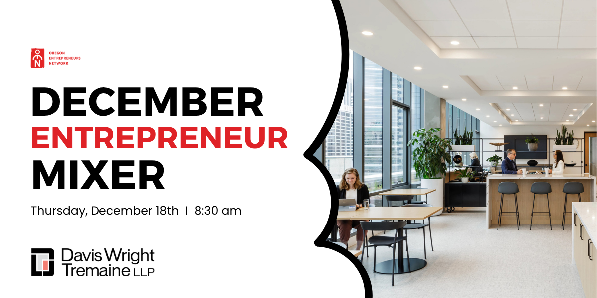 Enjoy a morning just for entrepreneurs and founders at the Oregon Entrepreneurs Network (OEN) December Entrepreneur Mixer from 8:30 – 10:00 am on Thursday, December 18th sponsored and hosted by Davis Wright Tremaine.