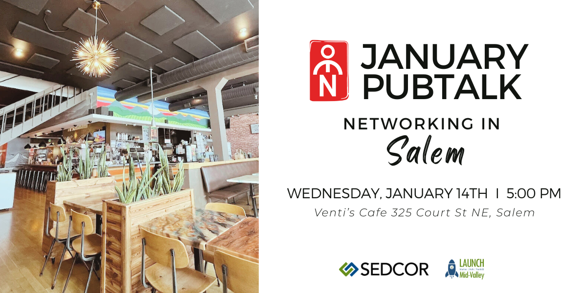 We’re teaming up with our friends at SEDCOR and Launch Mid-Valley for the January PubTalk on Wednesday, January 14th at 5:00 p.m. at Venti’s Café in Salem.