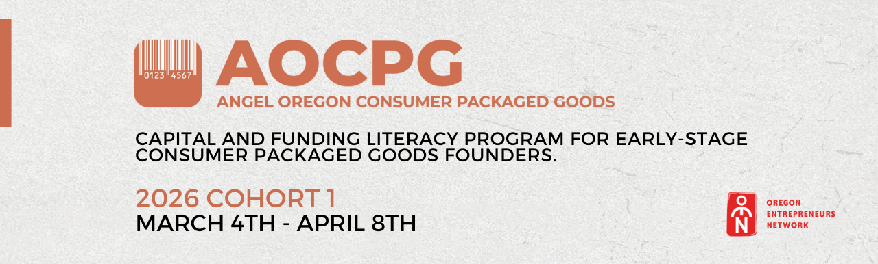 Angel Oregon CPG (AOCPG) is OEN’s ‘Capital & Funding Literacy’ program for early-stage consumer packaged goods founders in Oregon and Southwest Washington who are preparing to raise capital and scale their brands.