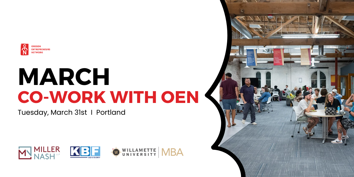 Oregon Entrepreneurs Network is partnering with our friends at Miller Nash to host Co-Work with OEN on Tuesday, March 31st from 9:00 am - 4:00 pm at Willamette University MBA's Portland Campus.