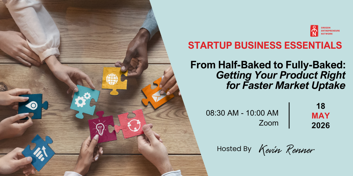 On Monday, May 18th don't miss out on From Half-Baked to Fully-Baked: Getting Your Product Right for Faster Market Uptake, an insightful presentation by Kevin Renner in partnership with Oregon Entrepreneurs Network starting at 8:30 am on Zoom.